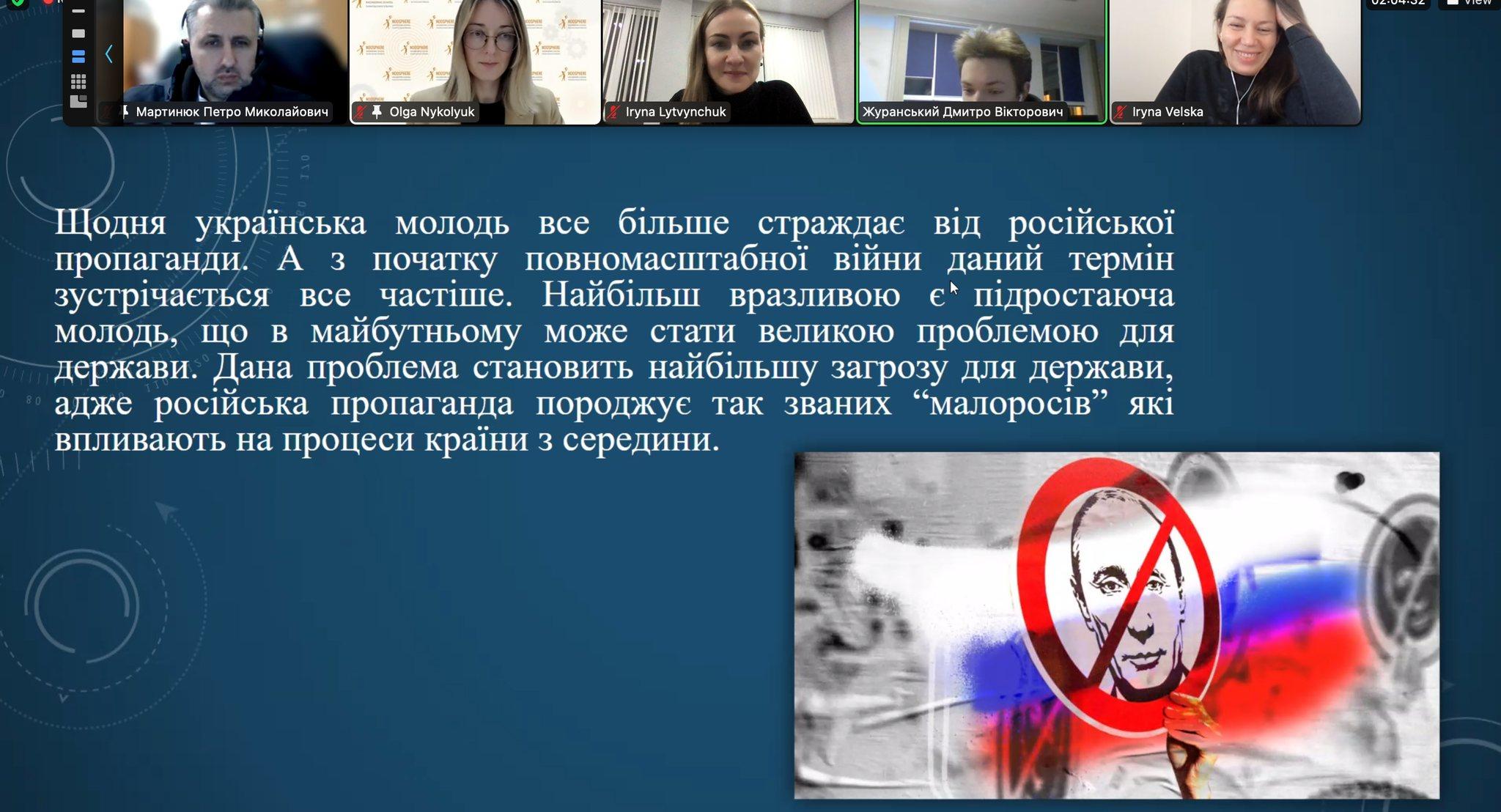 The purpose of the project is contributing to social stability of the state under the conditions of war through the cybersecurity literacy building of youth. Project activities included training and educational events on technological solutions to counter disinformation campaigns. The target audience of the project are students specializing in cybersecurity and information technologies from all over Ukraine, aged 18-25, and preference will be given to representatives of the regions of the most active hostilities. The idea of the project appeared as a response to Russian information attacks and disinformation campaigns in Ukraine aimed at spreading false information about the situation on the front line, the actions of the UА Armed Forces, territorial defense units, etc.; inciting social conflicts and shaking the mental state of the people; destabilization of the socio-economic system in the state. Expected project outcomes are (1) the formation of a critical mass of active local youth who will be able to manage ciberattacks ; (2) developing ideas and methods for disseminating tools and technological solutions to counter disinformation campaigns among ukrainian residents; (3) awareness-raising of cibersecurity tools among civic society. Priority themes of the Eastern partnership civil society facility that this fellowship project addresses include (1) mitigating misinformation campaigns about the crisis and about refugees; (2) support to IDPs and refugees to access any relevant information including through civic tech solutions, etc; and (3) advocacy campaigns and actions related to conflict resolution/peace building/etc.